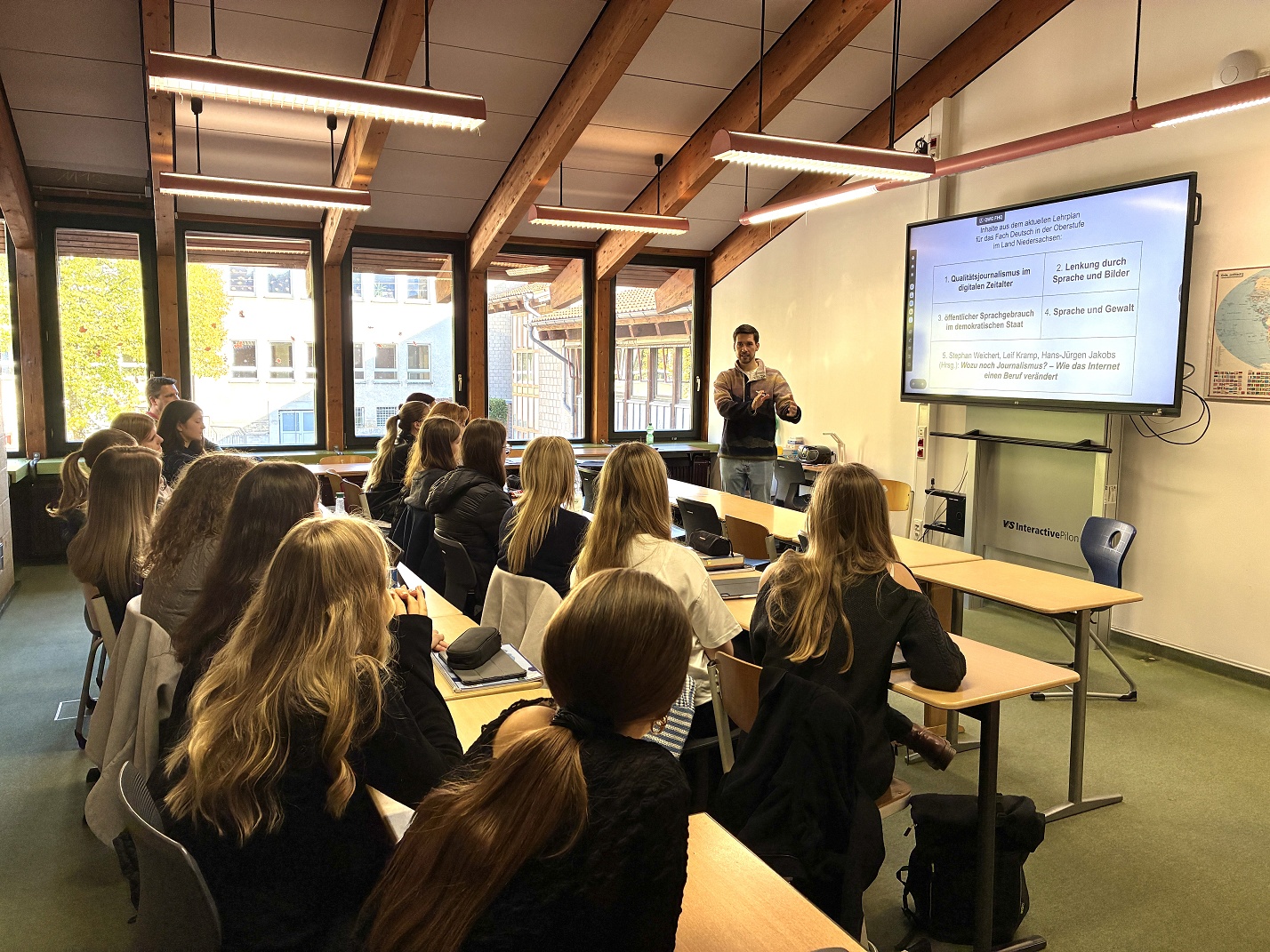 Seit mittlerweile vier Jahren ist Vassili Golod Pate des Humboldt-Gymnasiums Bad Pyrmont. Seit ziemlich genau zwei Jahren leitet er das ARD-Hauptstadtstudio in Kyjiw. Am Mittwoch, dem 24. September 2025, nahm sich Golod die Zeit, um zunächst mit vier unterschiedlichen Lerngruppen der Frage von Journalismus im Krieg im Gespräch nachzugehen. Dabei diskutierte er im Politikunterricht; aber auch ein Deutschkurs auf erhöhtem Niveau im 13. Jahrgang überlegte mit ihm, wie sich „Sprache in politisch-gesellschaftlichen Verwendungszusammen-hängen“ verhält und was das mit uns macht. Diese etwas sperrig anmutende Phrase ist ein Pflichtthema für das Deutschabitur 2026 und so bekamen unsere Schüler neue Impulse von einem, dessen tagtägliches Werkzeug die Sprache ist.