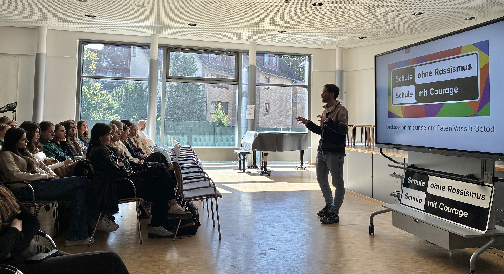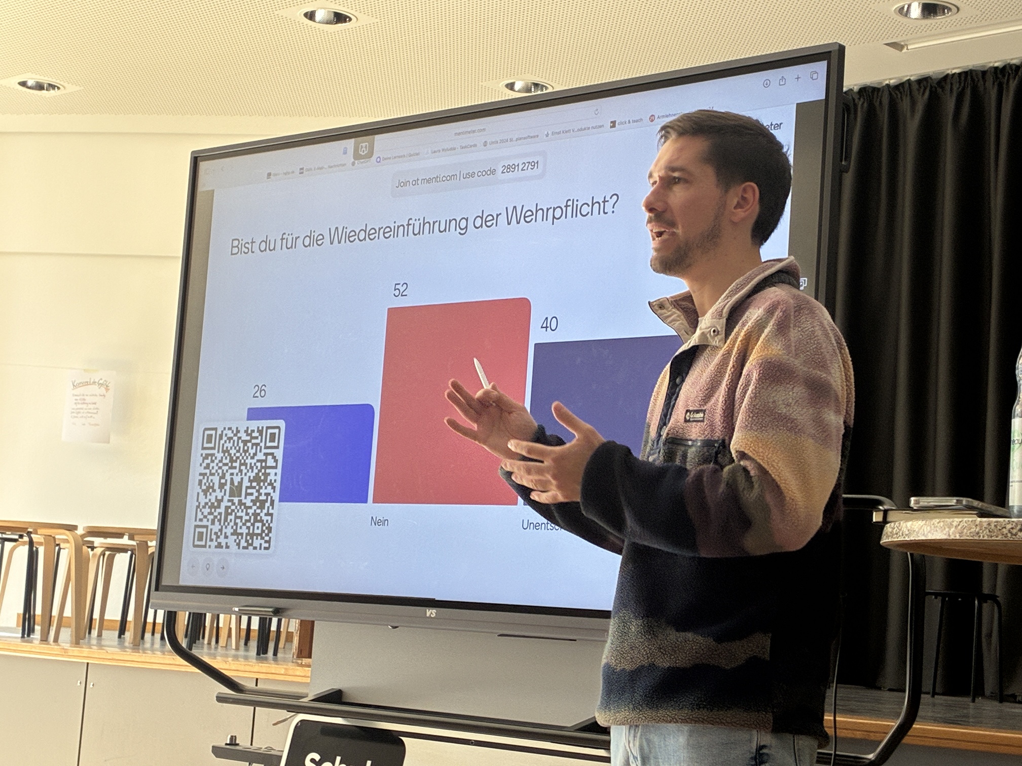 In der 5. und 6. Stunde stellte sich Golod einer Fragerunde im MuPa. Hierbei beeindruckte die Bandbreite der Themen: Die Wirkungsmacht von Podcasts, Meinungsfreiheit in unterschiedlichen Ländern, ethische Verantwortung von Journalisten und was überhaupt als Journalismus gelten sollte, waren Aspekte, die kluge Denkanstöße lieferten. Über ein digitales Stimmungsbarometer wurde von den Schülerinnen und Schülern des 11. und 12. Jahrgangs erfragt, wie sie zur Einführung der Wehrpflicht stehen, bevor im Anschluss die Sinnhaftigkeit eines Gesellschaftsjahres diskursiv aufgegriffen wurde. Persönlich und emotional wurde es, als Vassili Golod von seinen familiären Wurzeln sprach, über Luftalarm im Krieg berichtete und dies mit einer Alarm-App für alle eindrücklich demonstrierte. Mit Sicherheit hat dieser Besuch unseres Paten bei ganz vielen Zuhörerinnen und Zuhörern Spuren hinterlassen.