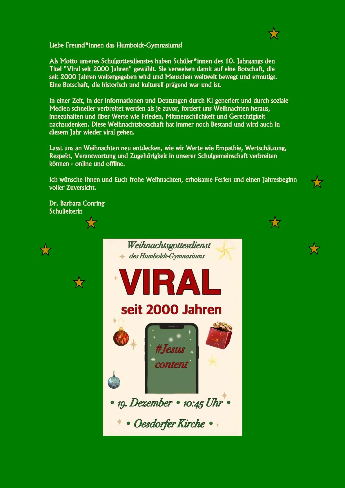 Weihnachtsgruß der Schulleiterin verbunden mit Einladung zum Gottesdienst