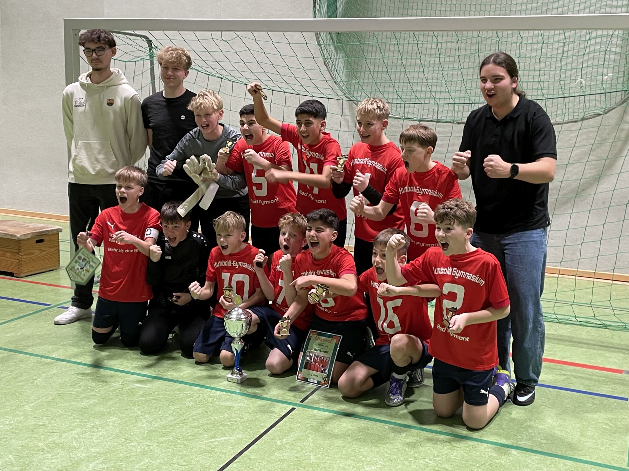 Eine Auswahl aus zwölf Schülern der Klassenstufen 5 bis 7 (die bei vier verschiedenen Vereinsmannschaften aktiv sind) sowie drei Junior-Coaches vertraten das Humboldt-Gymnasium bei der Fahrt nach Magdeburg - und konnten ein wenig überraschend dem erstmaligen Titelgewinn bei diesem Turnier 2025 gleich den nächsten Triumph folgen lassen!