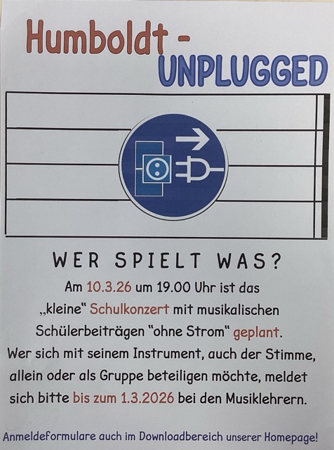 Aufgrund zu erwartender extremer Witterungsverhältnisse hat der Landkreis Hameln-Pyrmont einen Entfall des Präsenzunterrichts an allen Grund- und weiterführenden Schulen am Mittwoch, den 04. Februar 2026, angeordnet. Am Humboldt-Gymnasium findet stattdessen Distanzunterricht (Aufgaben oder Videokonferenzen) statt. Schülerinnen und Schüler werden darüber von ihren Lehrkräften über IServ informiert.