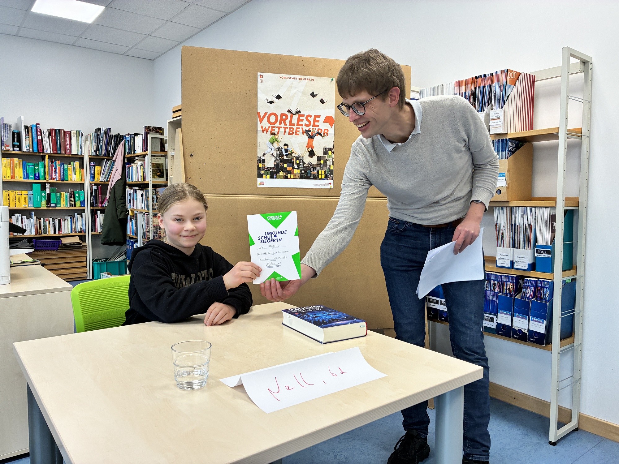 Es lasen aus der Klasse 6a Kareem Marouf, aus der 6b Lara Stobbe, aus der 6c Ludwig Drake und aus der 6d Nell Mäkler. Im Finale siegte schließlich Nell und wird das Humboldt-Gymnasium Bad Pyrmont nun auf der Kreisebene vertreten. Wir gratulieren herzlich und wünschen weiterhin neben Erfolg vor allem viel Freude beim Lesen und Vorlesen!