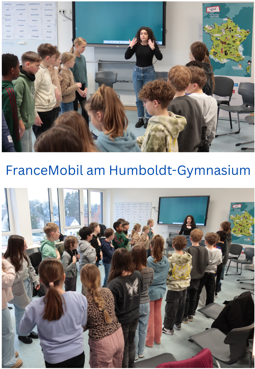 Das Humboldt-Gymnasium konnte am 14.01.2026 zum ersten Mal FranceMobil begrüßen, das mit seiner lebendigen Animation die Neugier der Fünftklässler*innen weckte. Die Klassen 5 konnten motiviert durch die Französin Juliette Rock die französische Sprache spielerisch entdecken und eigenständig anwenden. Ob bei ersten intuitiv verständlichen Dialogen, Reaktionsspielen oder Hörverstehensrätseln – überall standen Spaß, Bewegung und Interaktion im Mittelpunkt. Es war faszinierend, wie souverän sich die Schüler*innen mit Hilfe von Musik und Bewegung erste Redemittel zu eigen machten und so schon ganz früh Vertrauen in ihre eigene Sprachfähigkeit gewinnen konnten.