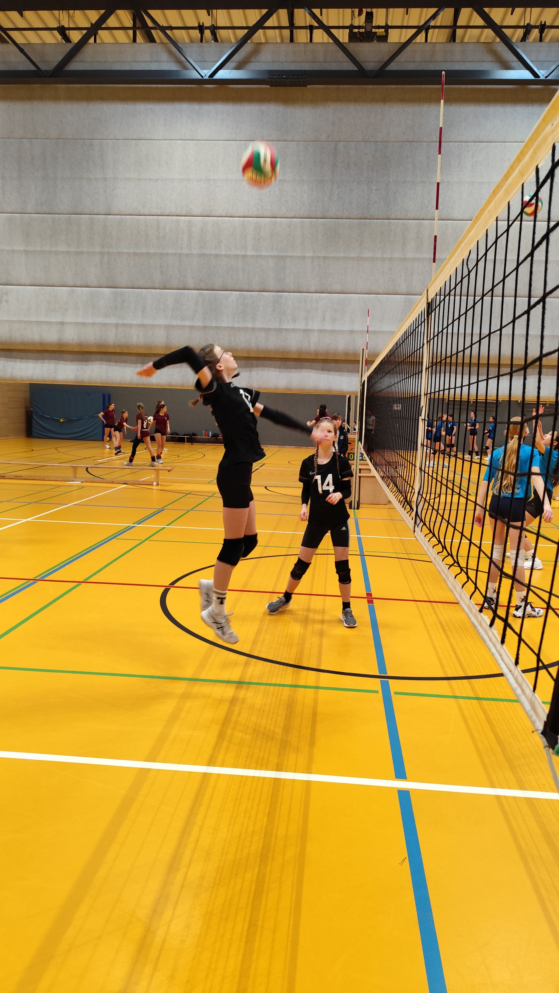 Da Zoe sich beim Bezirksentscheid einen Bänderriss zugezogen hatte und Lucia ebenfalls verletzungsbedingt ausfiel, musste Hannah, die normalerweise U14 gespielt hätte, in der U18 aushelfen. Eine weitere Herausforderung war, dass wir nur vier Vereinsspielerinnen hatten und Leonie sowie Shiloh nur als Hobby-Spielerinnen extra für diesen Tag eingesprungen sind. Trotzdem hat man gesehen, dass beide großartig gespielt haben. Besonders durch Leonies Blocks und Shilohs Annahmen hat man gemerkt, wie sehr sie zu einem tollen Turniertag beigetragen haben.