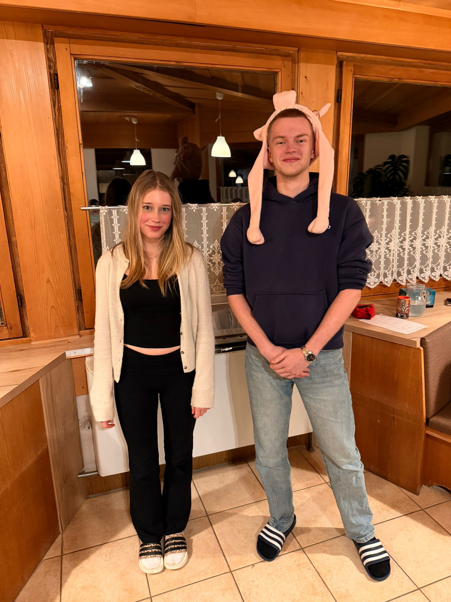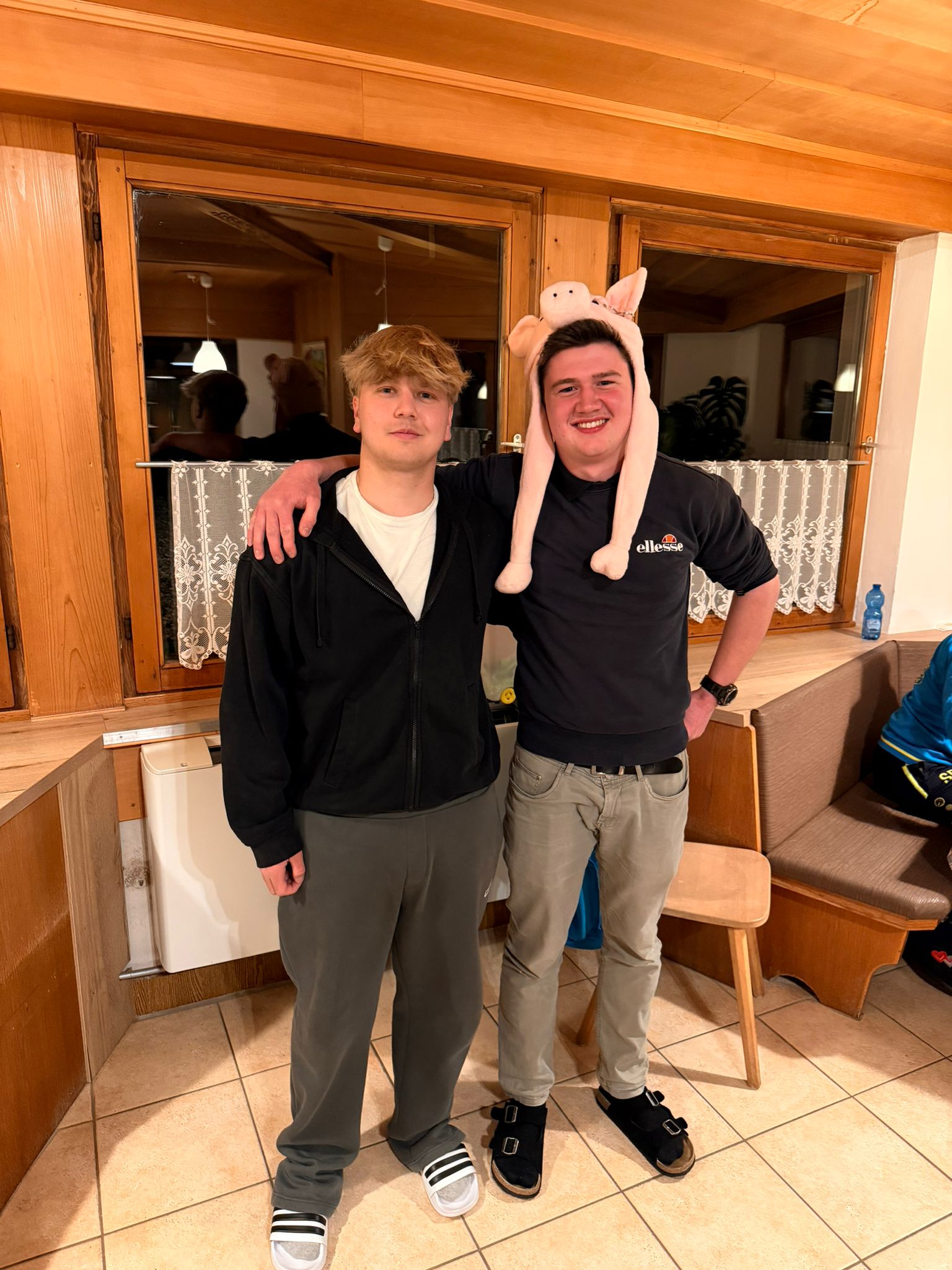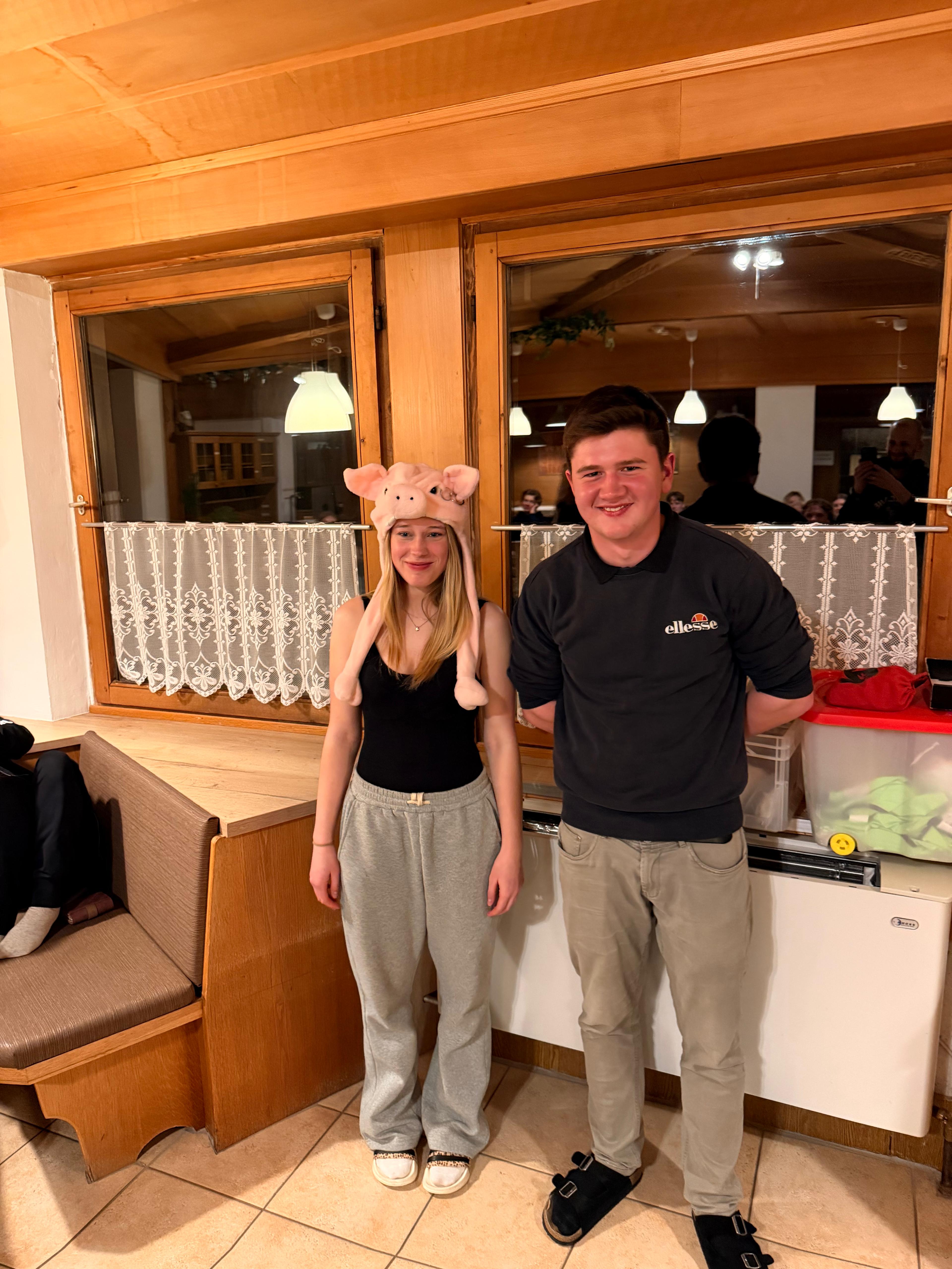 Nach einem langen Übungstag trafen wird uns zum Abschluss und kürten den hervorstechendsten Skifahrer der Gruppe zur "Pisten-Sau". Ich bin es leider geworden, da mir beim ersten Aufstieg auf den Berg ein Missgeschick passiert ist. Es war allerdings nicht das Einzige. Ich bin dummerweise die Piste weitergefahren und fast in einem Wald gelandet. Des Weiteren habe ich Frau Roesenberger umgefahren und bin einen Abhang runter, wo ich ebenfalls auf die Klappe geflogen bin. Natürlich haben wir noch einige Tage vor uns und es werden auch noch weitere Pistensäue gekürt.