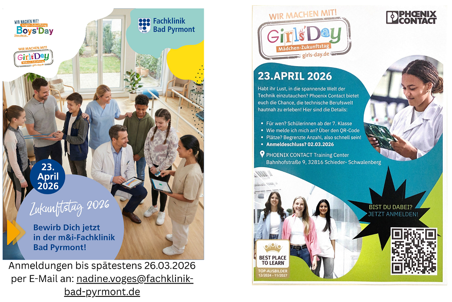 Am 23.04.2026 findet der diesjährige Zukunftstag für die Jahrgänge 5-9 statt. Nachstehend finden Sie den zugehörigen Elternbrief sowie die Antragsformulare für die Freistellung. Diese müssen bis zum 16.04.2026 bei den Klassenleitungsteams eingehen.