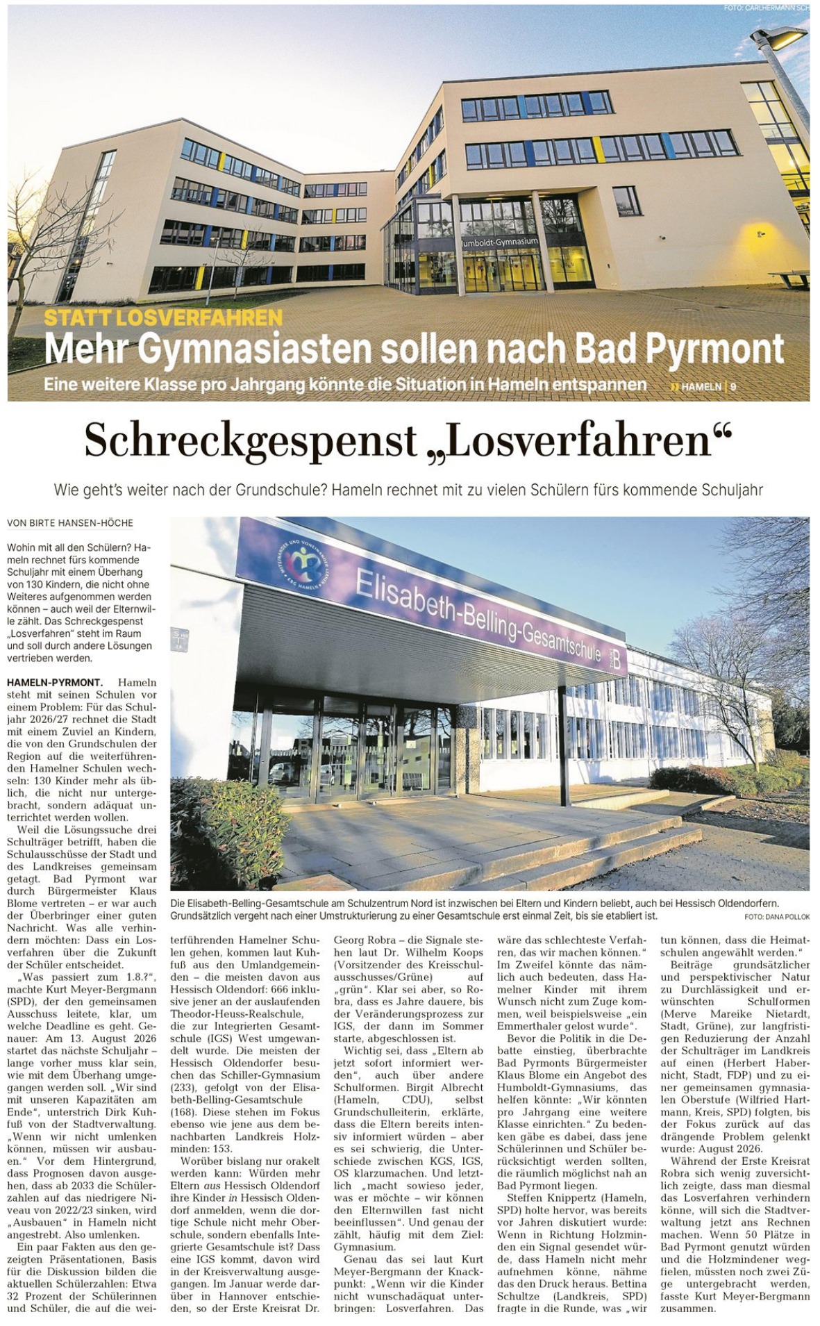 Bei einer gemeinsamen Tagung der Schulausschüsse von Stadt und Landkreis wurde über die Frage der künftigen Verteilung der Schülerinnen und Schüler debattiert. Aufgrund der Tatsache, dass die Hamelner Schulen mittlerweile an ihre Kapazitätsgrenzen geraten, überbrachte Bürgermeister Klaus Blome das Angebot, mehr Schülerinnen und Schüler, die möglichst nah an Bad Pyrmont wohnen, am Humboldt-Gymnasium aufzunehmen und dafür evtl. sogar eine weitere Klasse einzurichten.