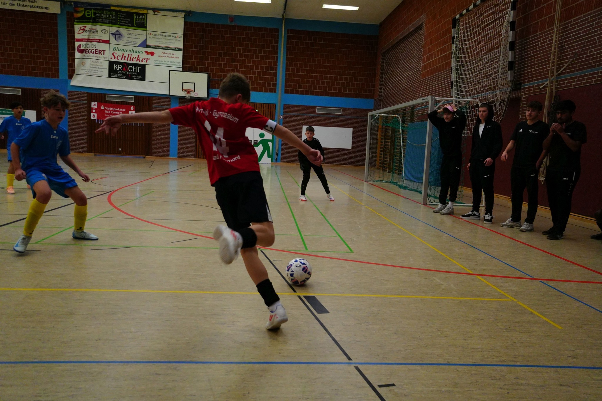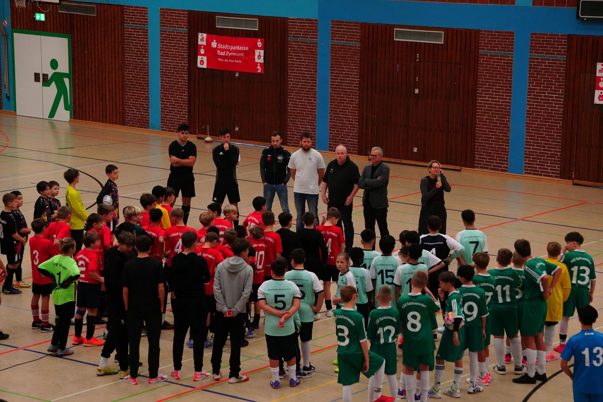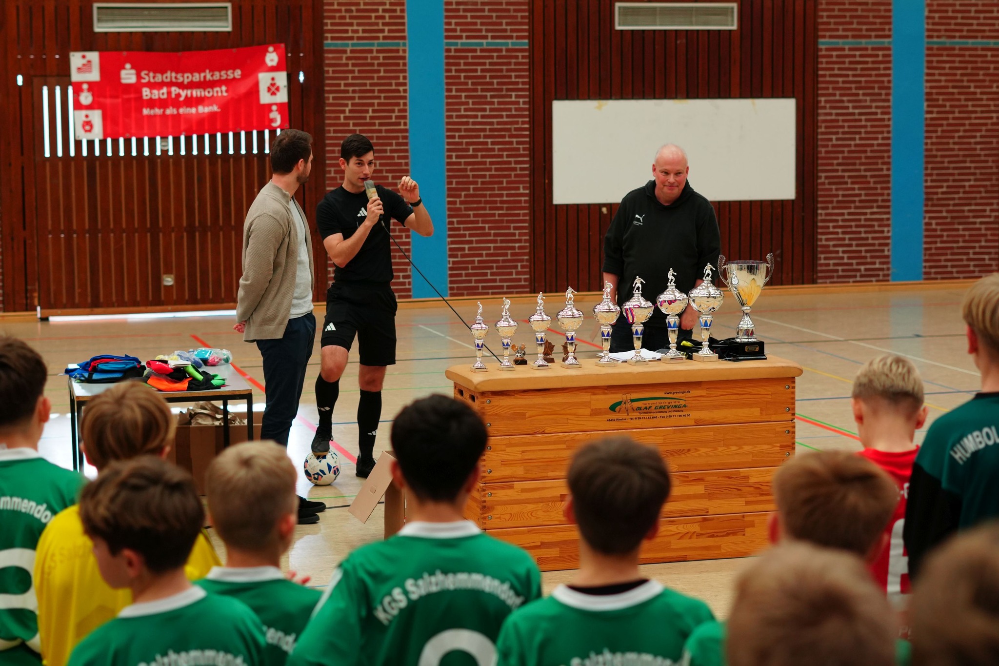 Die Stimmung bei den Zuschauern auf den Rängen und unter den Aktiven war wieder einmal hervorragend. Auch die 17. Auflage des "S-Indoor-Cups" war eine rundum gelungene Veranstaltung. Wir freuten uns über Grußworte von Jens Veneman vom Hauptsponsor, der Stadtsparkasse Bad Pyrmont, Schulleiterin Barbara Conring und Malte Fitzner (Schulfußball-Beauftragter des Kreises Hameln-Pyrmont). Dank gebührt vor allem eben dem Namensgebe, der den fantastischen Rahmen dieses Turniers Jahr für Jahr ermöglicht, dem Elternverein, dem 12. Jahrgang, der für Hallenaufsicht und Turnierregie sorgte, dem Cafeteria-Team des Abijahrgangs für das Catering, dem Schulsanitätsdienst, der sich kompetent um einige Blessuren kümmerte, Hausmeister Markus Schäfer, den tollen Schiedsrichtern Can Yilmaz und Nils Hasse, Moritz Lehzen und Valentin Woitkewitsch, die das Turnier fotografisch begleiteten, sowie den Junior-Coaches Junior Coaches Serkan Abubaker Saqib, Adrian Grincenko, Elias Tappe, Luca Schröder Nevio Widerstein, Rayan Saqib und Silvan Kollenberg, die die beiden Teams des Humboldt-Gymnasiums sehr engagiert und organisiert vorbereiteten und betreuten. Wir freuen uns auf ein Wiedersehen zum dann bereits 18. "S-Indoor-Cup" im Dezember 2026!