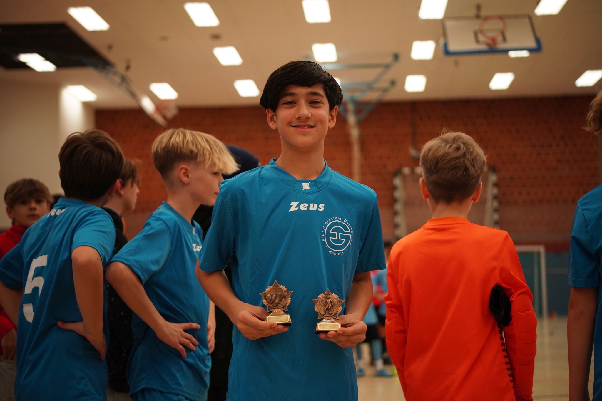 Bei der Siegerehrung erhielt dann wie immer jede Mannschaft einen Pokal, einen Ball und eine Urkunde. Für die drei erstplatzierten Teams gab es zusätzlich Medaillen und kleine Sachpreise für jeden Spieler - zudem individuelle Auszeichnungen für Elyas Jabari (AEG), der mit neun Treffern erfolgreichster Torschütze des Turniers war und zudem von den Betreuern auch zum besten Feldspieler gewählt wurde, sowie Thore Ahlbrecht (Humboldt 2), der als bester Torhüter ausgezeichnet wurde.