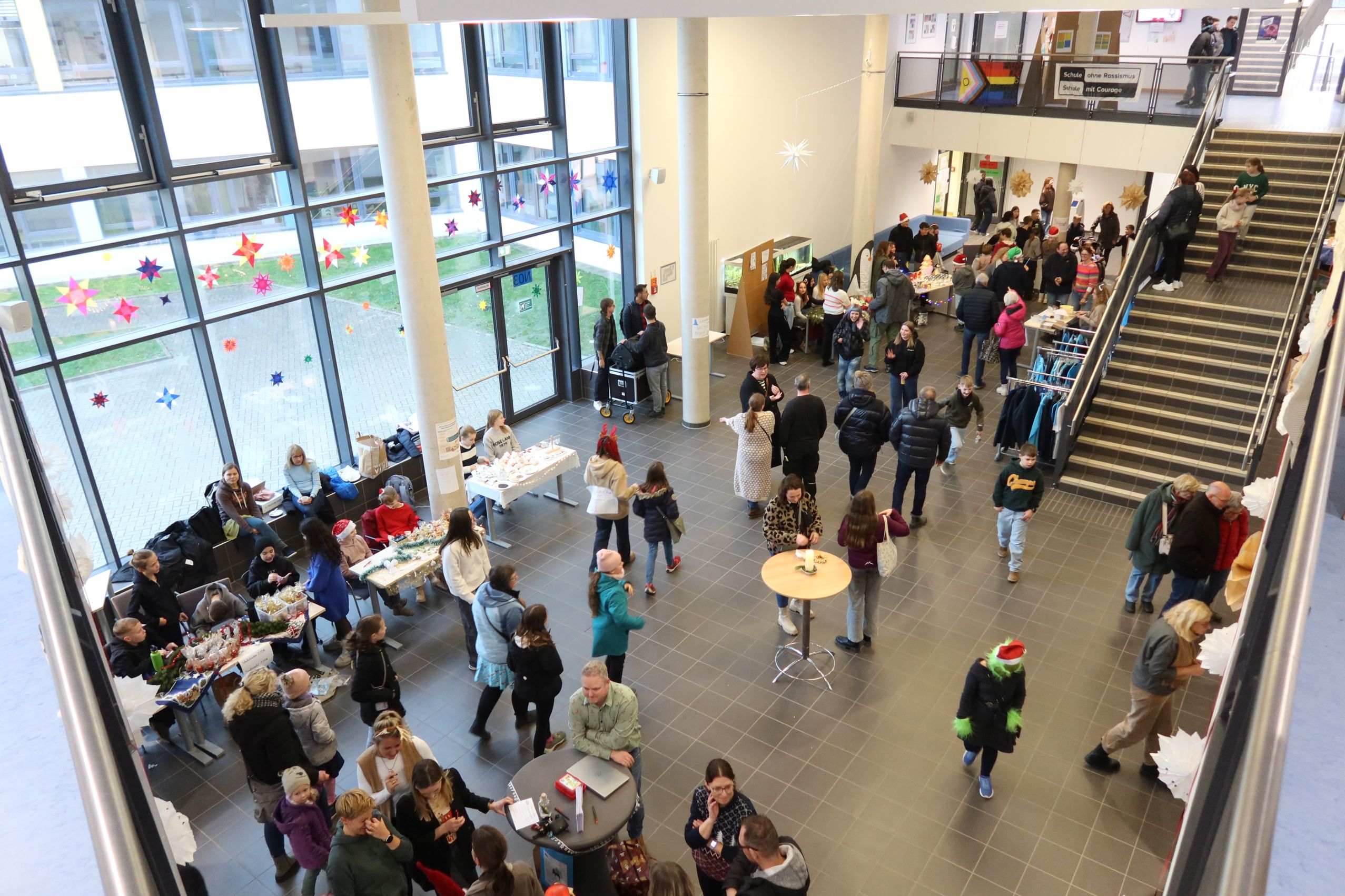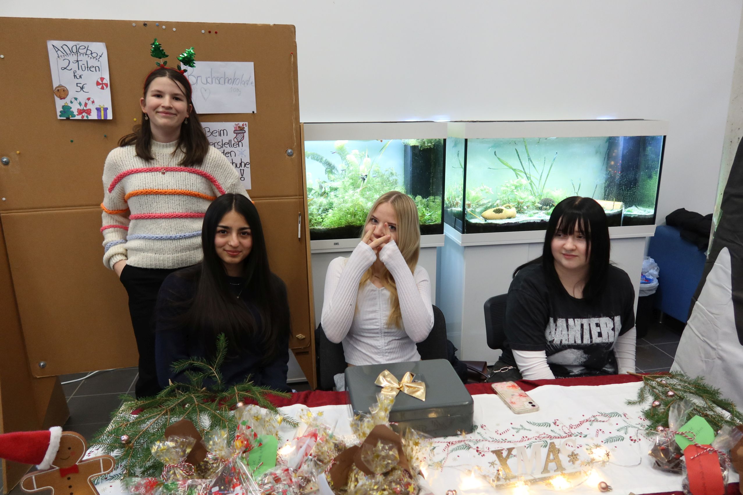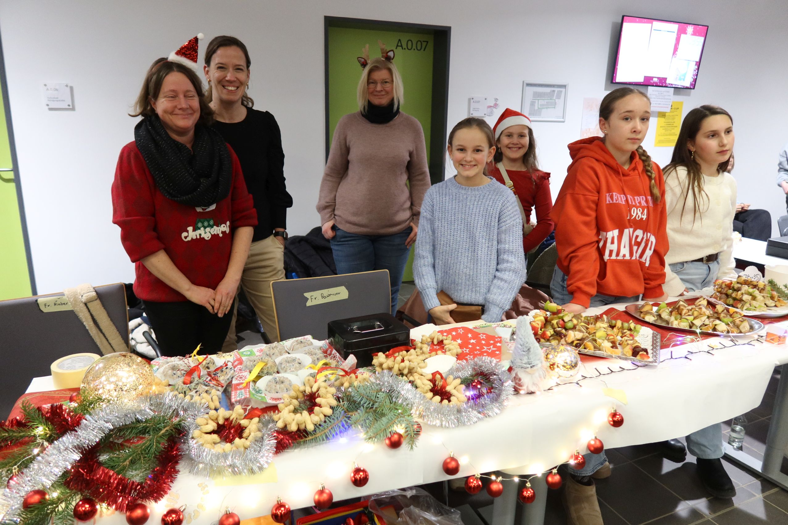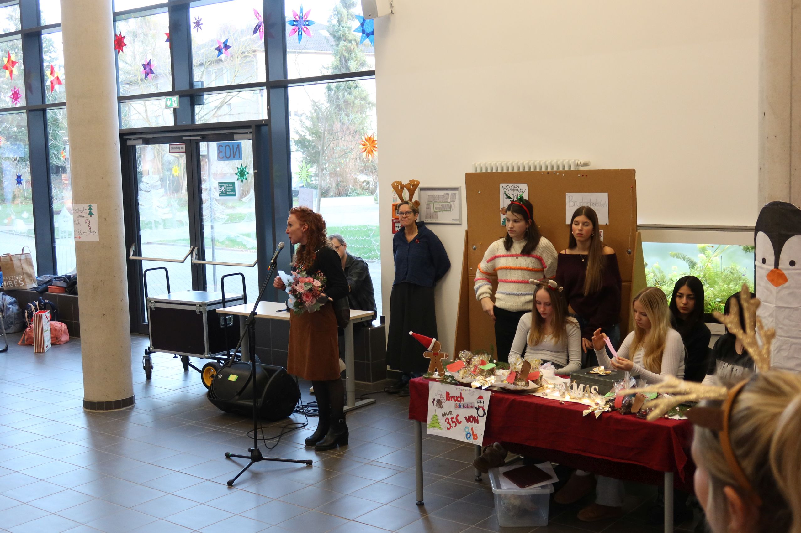 Für eine besonders festliche Atmosphäre sorgte auch das Rudelsingen, bei dem eine Gruppe aus Sängerinnen und Sängern durch die Schule zog und an unterschiedlichen Stellen Weihnachtslieder sang. Auch Weihnachtsmann und Schneemann tauchten immer wieder auf dem Markt auf.