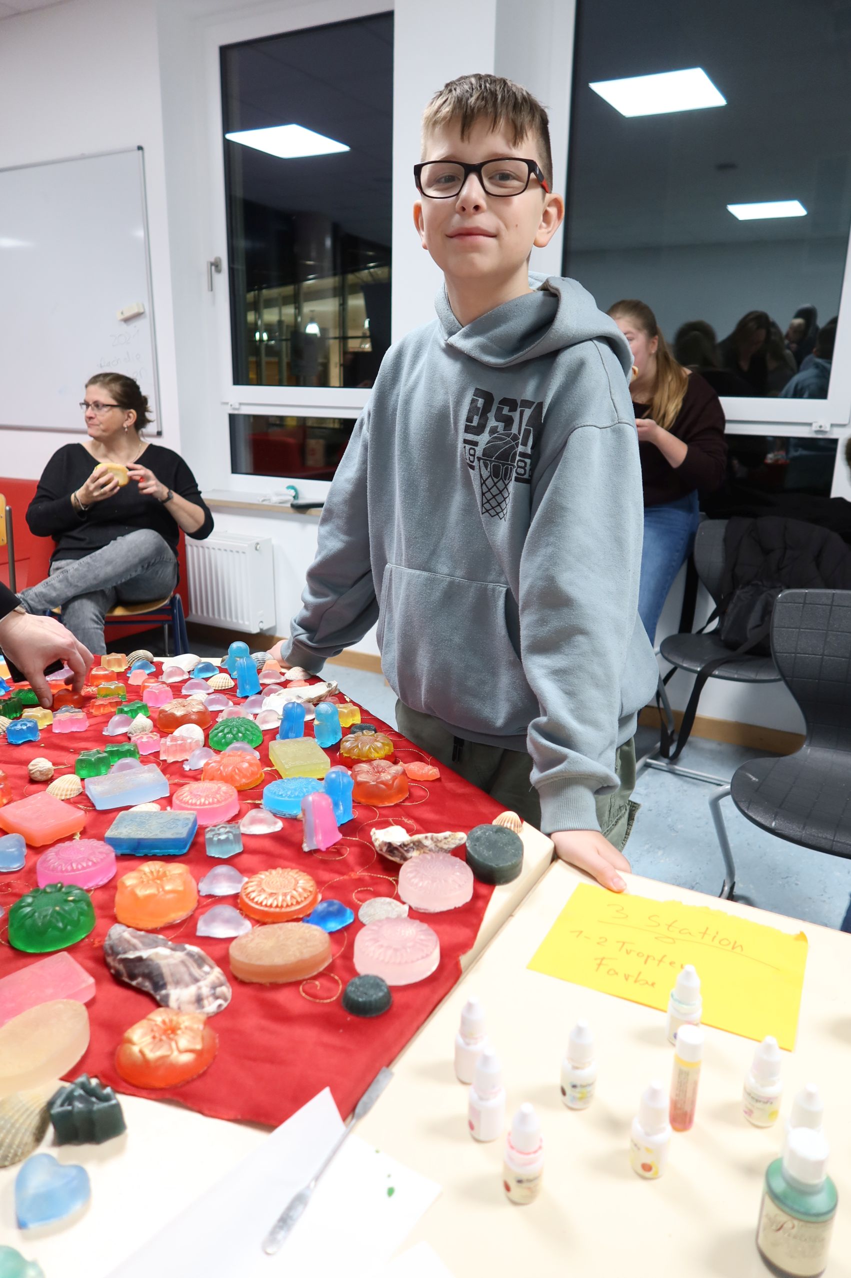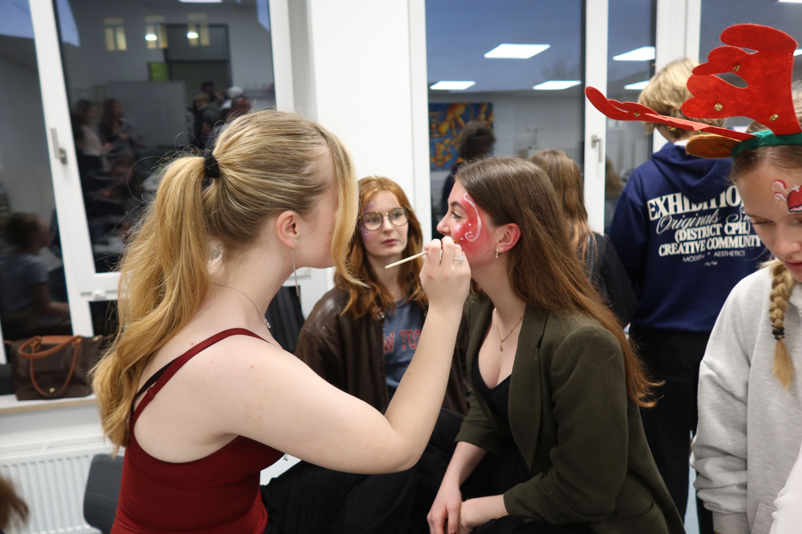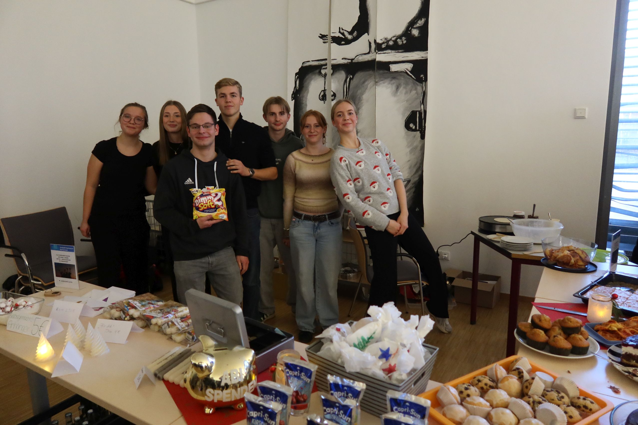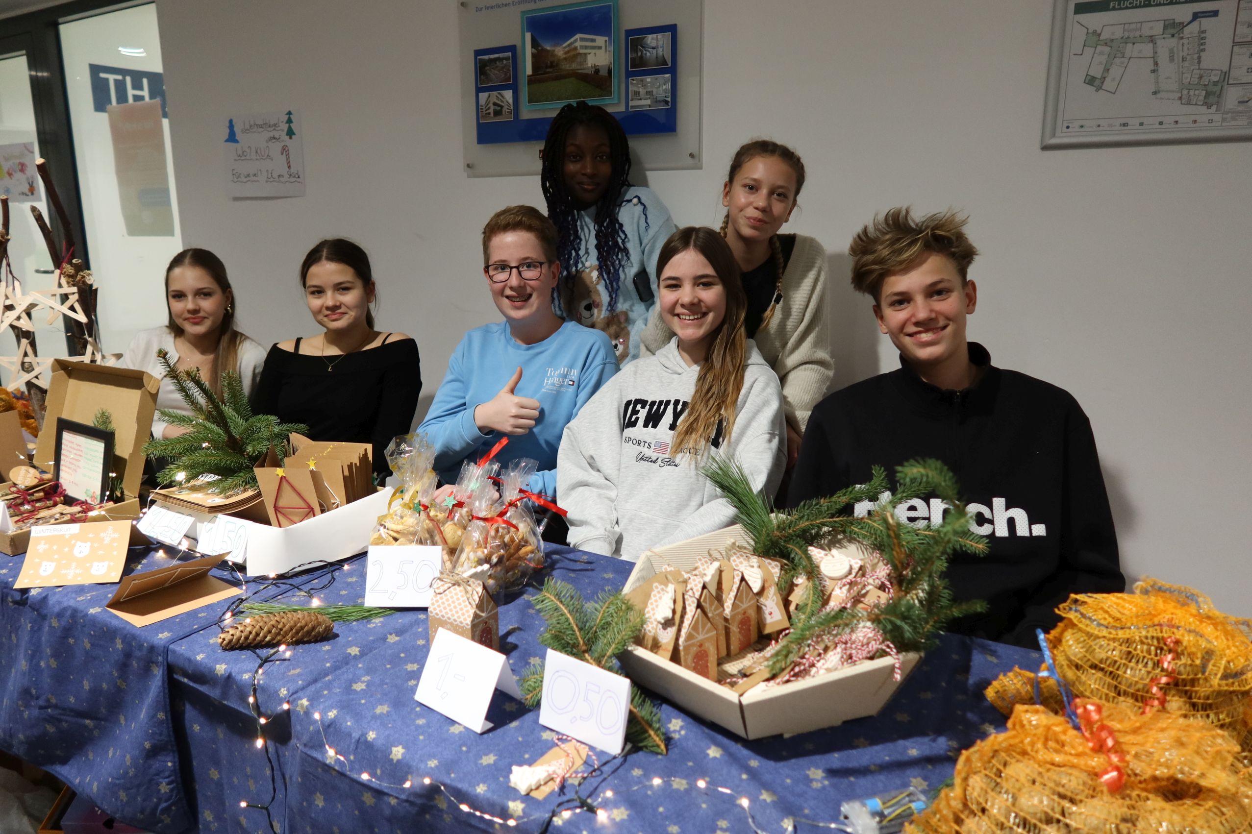 Für eine besonders festliche Atmosphäre sorgte auch das Rudelsingen, bei dem eine Gruppe aus Sängerinnen und Sängern durch die Schule zog und an unterschiedlichen Stellen Weihnachtslieder sang. Auch Weihnachtsmann und Schneemann tauchten immer wieder auf dem Markt auf.