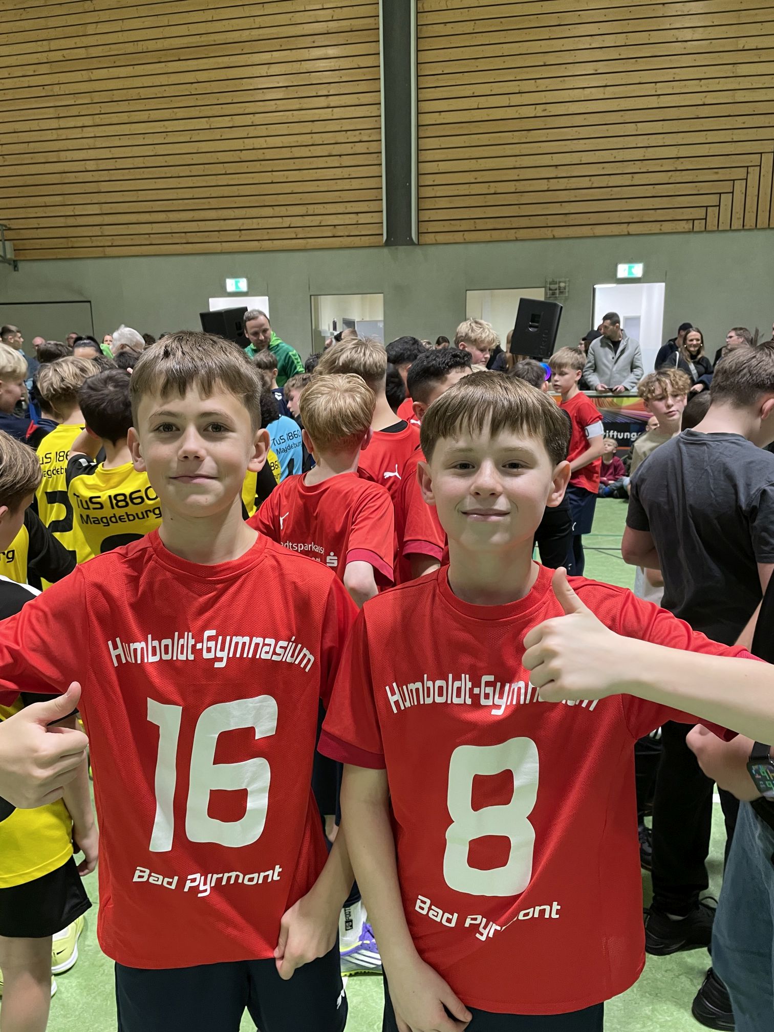 Eine Auswahl aus zwölf Schülern der Klassenstufen 5 bis 7 (die bei vier verschiedenen Vereinsmannschaften aktiv sind) sowie drei Junior-Coaches vertraten das Humboldt-Gymnasium bei der Fahrt nach Magdeburg - und konnten ein wenig überraschend dem erstmaligen Titelgewinn bei diesem Turnier 2025 gleich den nächsten Triumph folgen lassen!