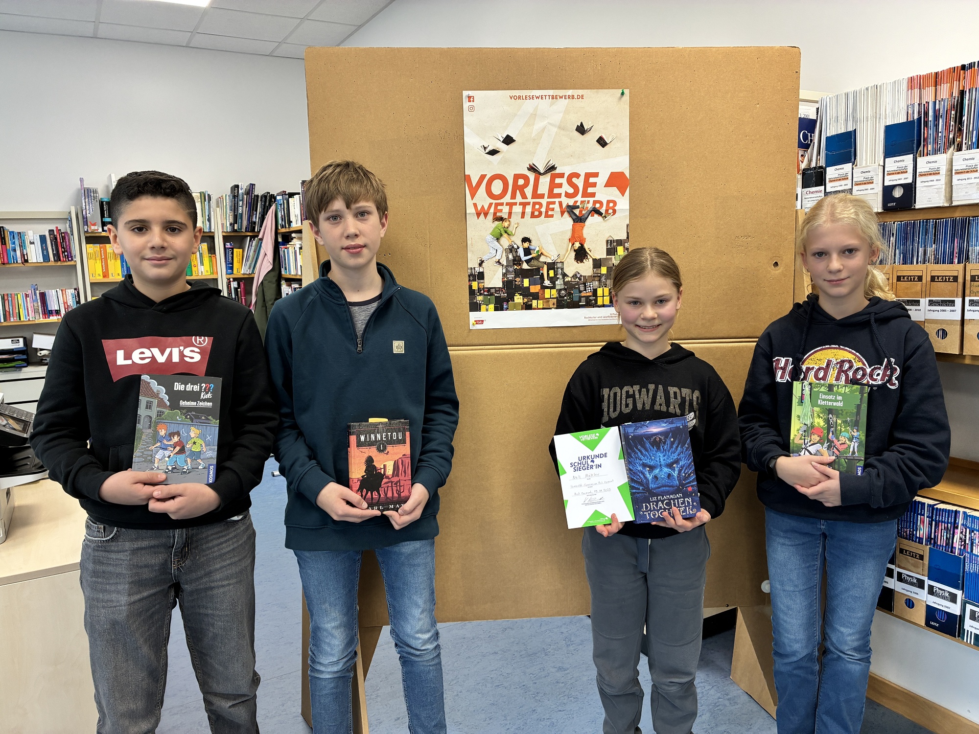 Es lasen aus der Klasse 6a Kareem Marouf, aus der 6b Lara Stobbe, aus der 6c Ludwig Drake und aus der 6d Nell Mäkler. Im Finale siegte schließlich Nell und wird das Humboldt-Gymnasium Bad Pyrmont nun auf der Kreisebene vertreten. Wir gratulieren herzlich und wünschen weiterhin neben Erfolg vor allem viel Freude beim Lesen und Vorlesen!